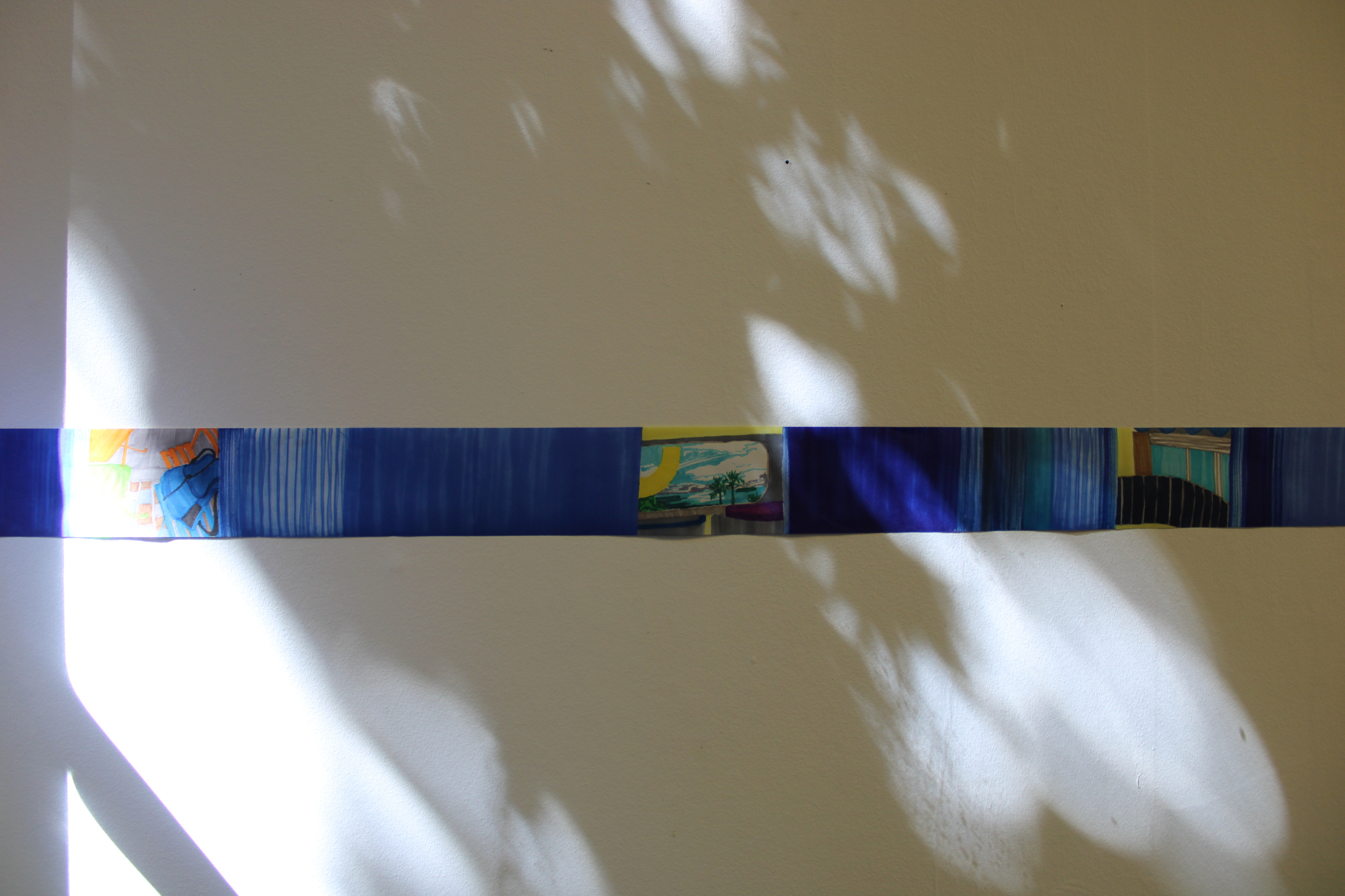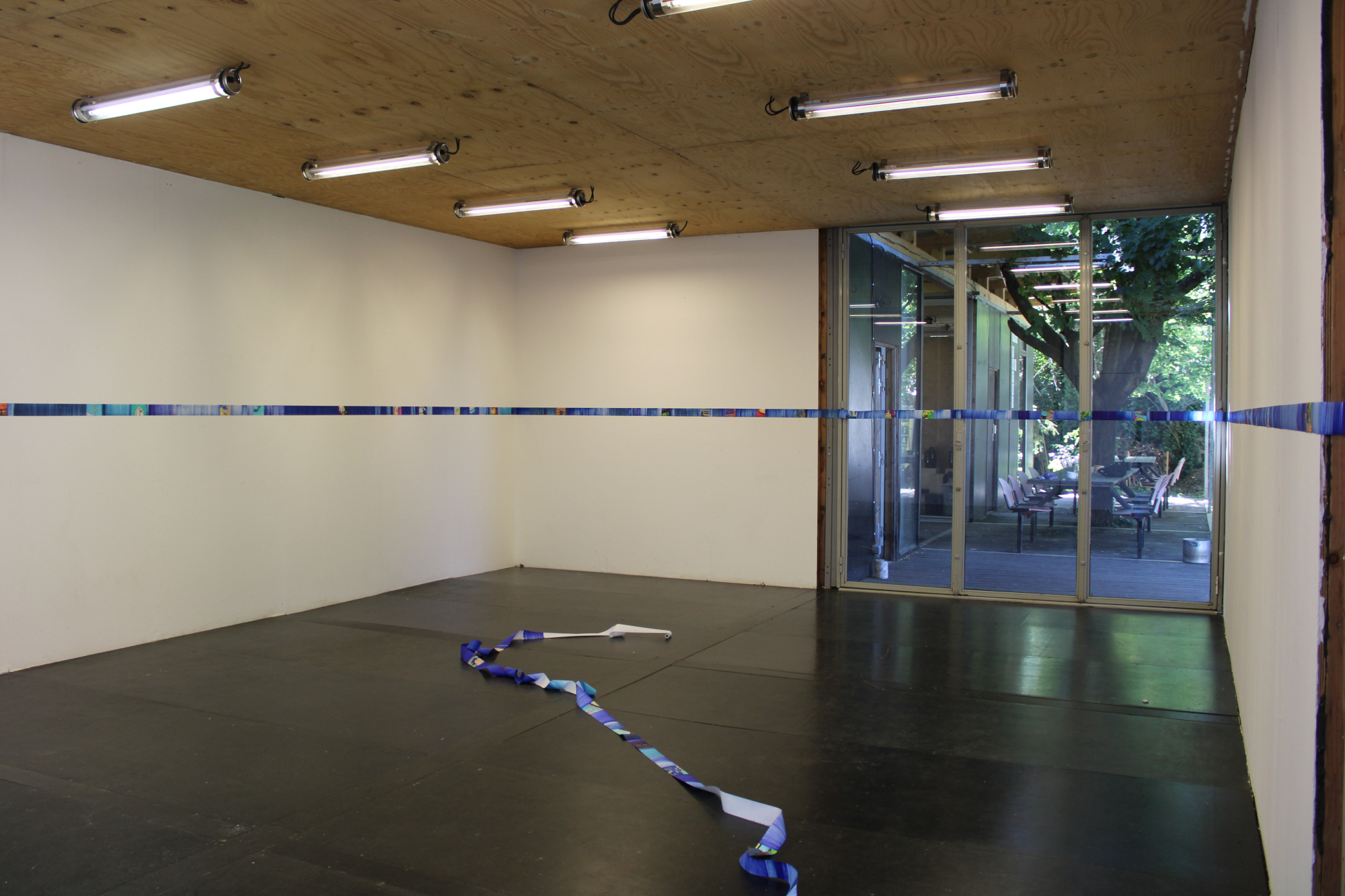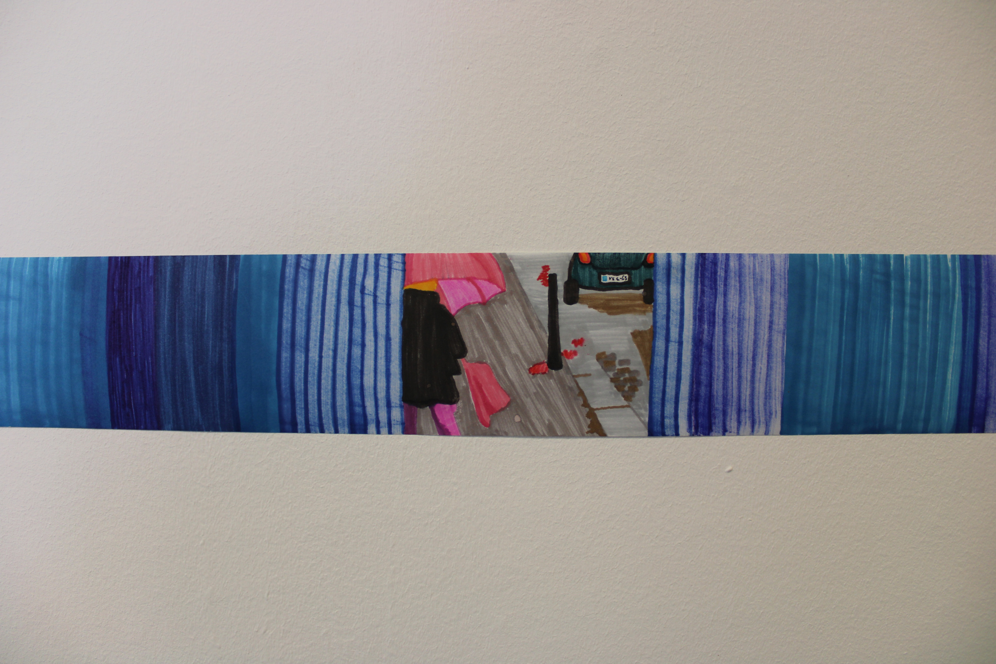 Dans le cadre de cette résidence, elle a dessiné et écrit. Elle a augmenté son rouleau (ensemble de dessins réalisés au feutre sur un long rouleau de papier fin, à partir de photos prises sur son téléphone), qu’elle a déployé dans l’espace, pour la 1ère fois, à l’occasion de sa restitution, comme une longue frise à hauteur d’oeil, suggestive d’une ligne d’horizon. Lors des Open Studios, elle a proposé des lectures de ses textes en cours, évoquant des instants de vie que l’on retrouve au sein de ses dessins du rouleau sans fin. Pour sa restitution, elle a également créé un paysage de textes, accrochés en ligne au mur, faisant face à la ligne de dessins.