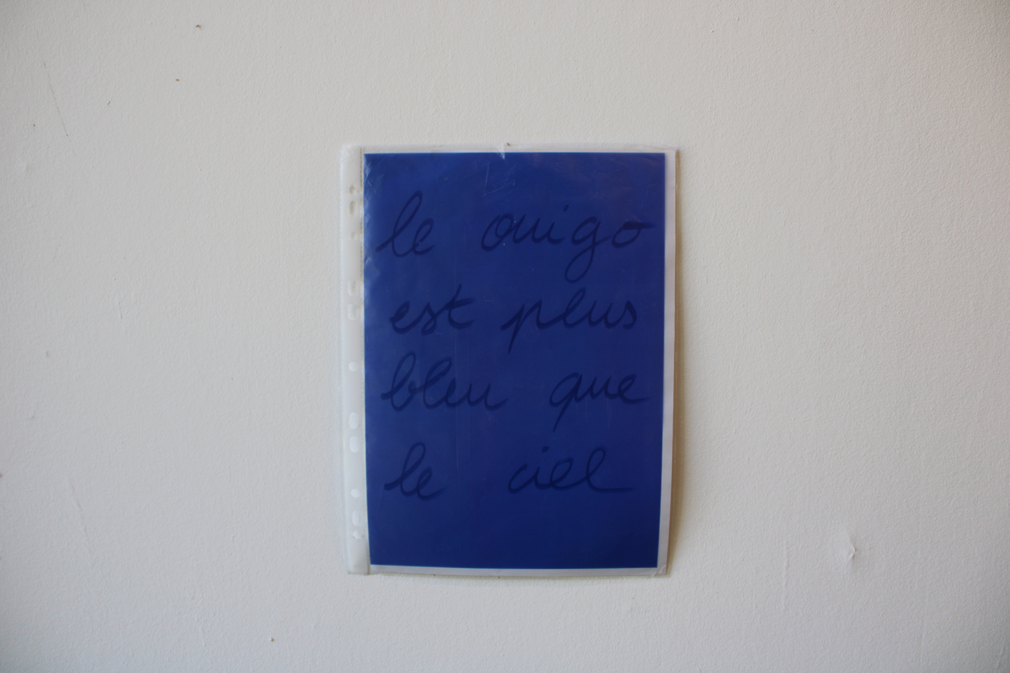 Aujourd’hui, un peu avant l’arrivée à Paris le train s’arrête. La fenêtre choisit d’encadrer une maison bleue. C’est une grosse maison, plus grande que les autres, on ne voit qu’elle dans le gris.