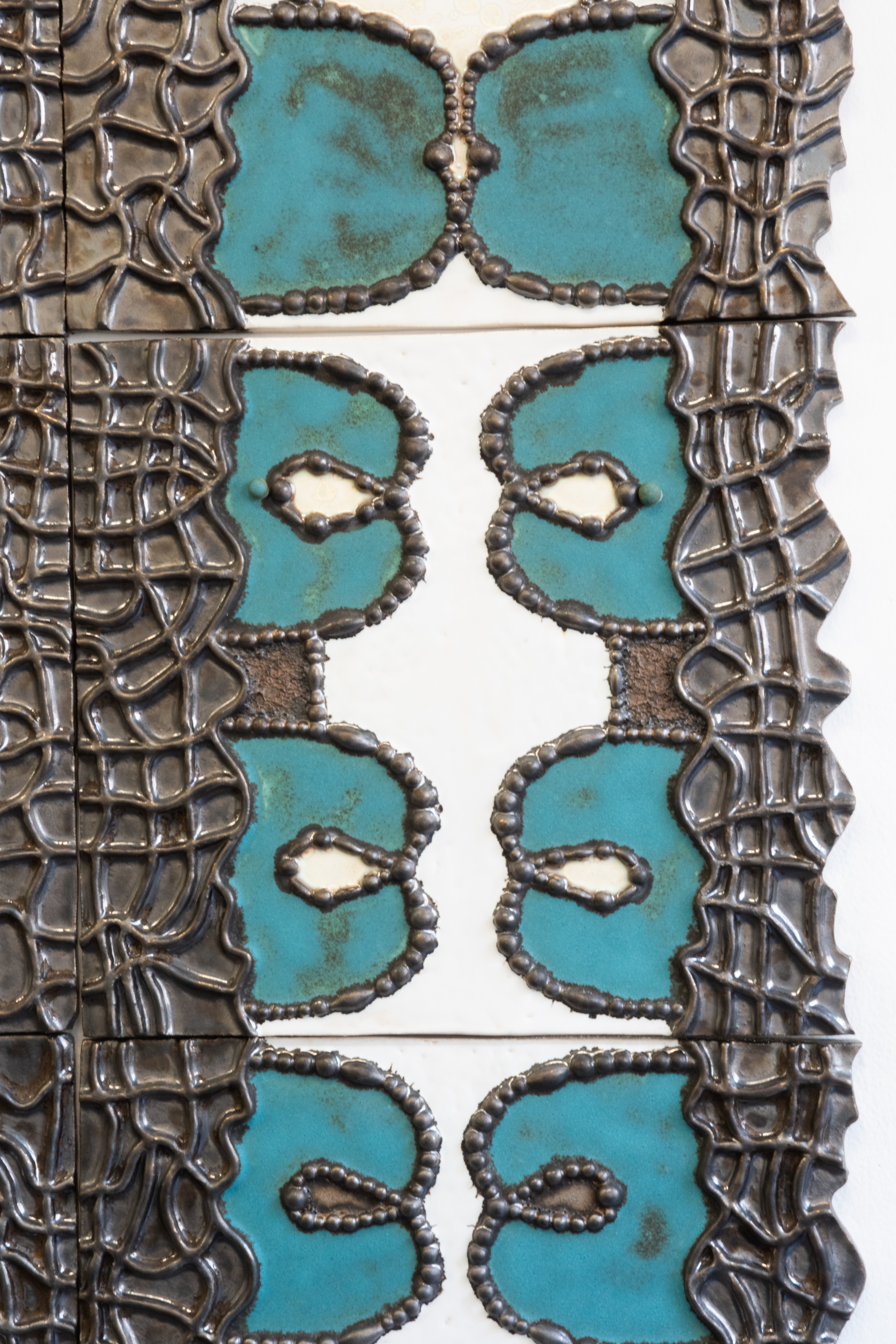 Coupe-feu, artist Marie Pic's first solo show, is divided into two chapters, and invites us to explore notions of passage and threshold, through sculptural forms that blend architecture and the plant world. At once familiar and unsettling, the silhouettes of doors and gates - conceived as symmetrical bas-reliefs, inspired by Art Nouveau or 17th-century jewelry - create a dialogue between nature and craft, reinforcing the mental boundary between inside and outside. Locks, keys and padlocks, suspended like bunches by chains, evoke a precarious balance between vulnerability and security. All these glazed ceramic sculptures, with their metallic effect, recall the textures of ironwork, but also the minerality of precious stones, through subtle shades of water-green. Finally, Coupe-feu evokes the resistance of materials to flames, just like ceramics which, after being fired at over 1259 degrees, never burns, but transforms, like the colors that meet on its surface.