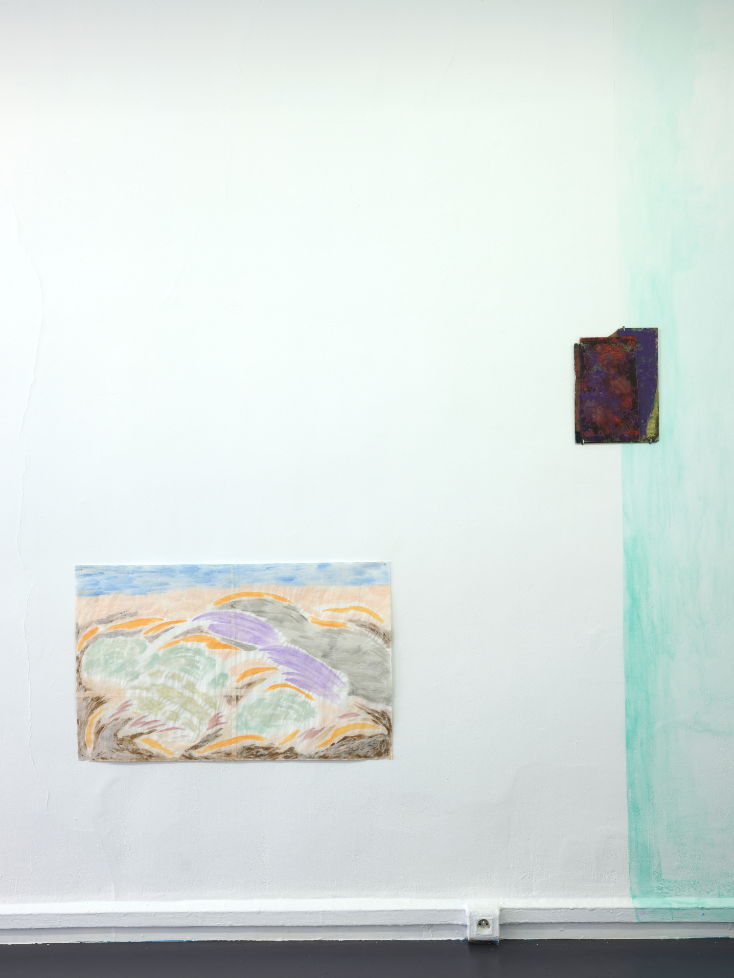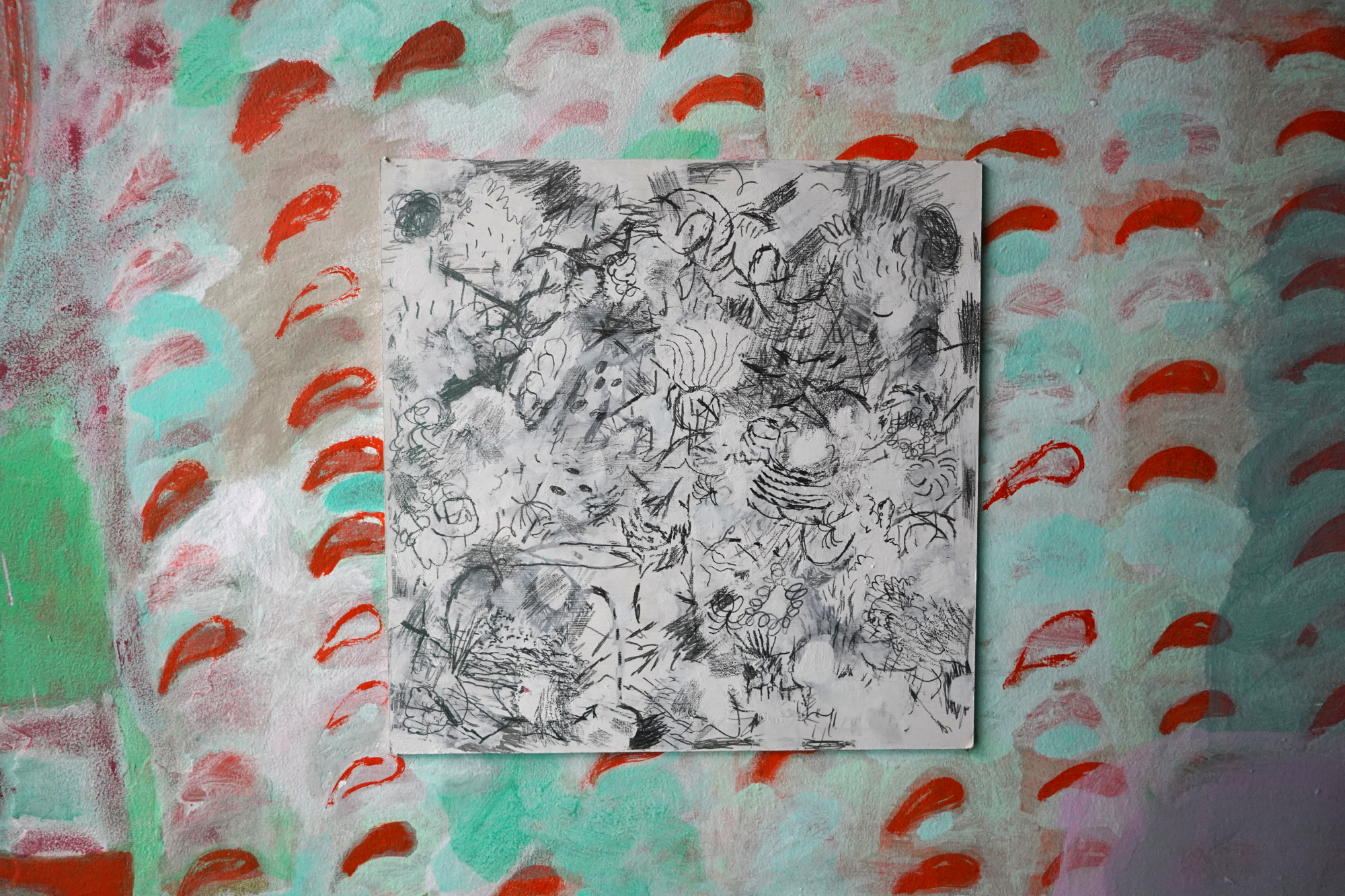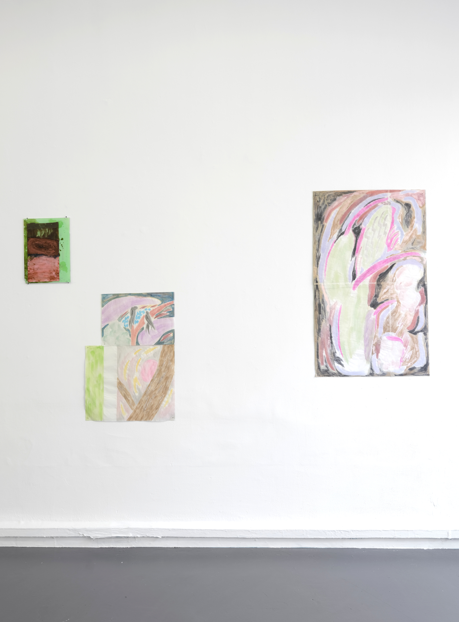 Comme beaucoup, les deux artistes ont engagé un mouvement de décentrement après la pandémie de Covid-19. Romain Bobichon est descendu dans le Tarn afin de vivre dans un bel endroit entouré d’ami.es. Amélie Charroin, s’est installée au sud-ouest de Lyon car elle voulait de l’espace pour créer et s’occuper de son enfant. Elle a délaissé les tables sur lesquelles elle travaillait dans des ateliers partagés pour peindre à la maison, directement sur le sol, avec ce qui était à sa portée : la vie, l’imaginaire, la routine domestique... Ses supports sont principalement faits de papiers recyclés. Elle utilise notamment des gouaches en pastille achetées au rayon scolaire des supermarchés, ce qui confère une qualité singulière à sa gamme colorée.