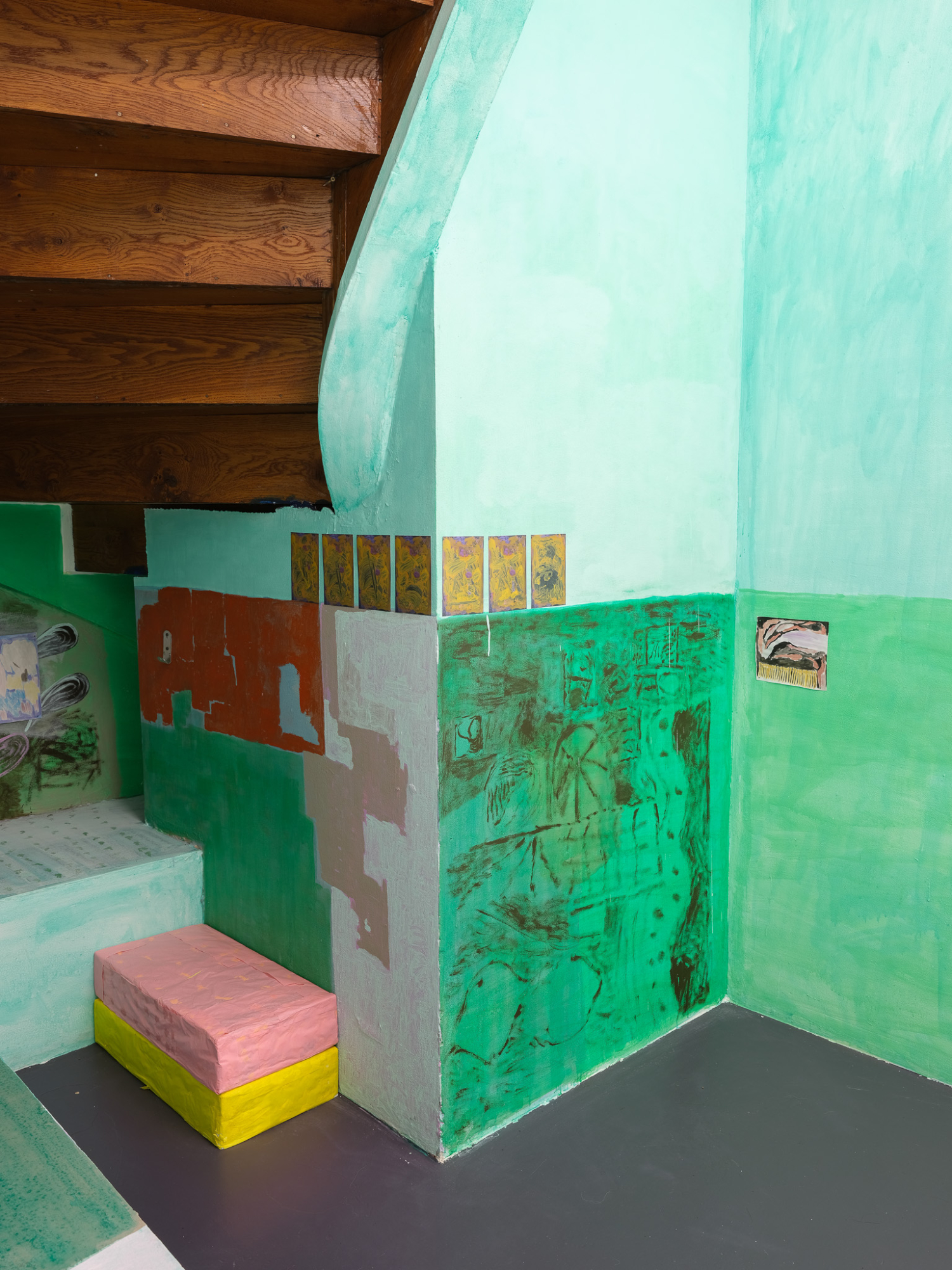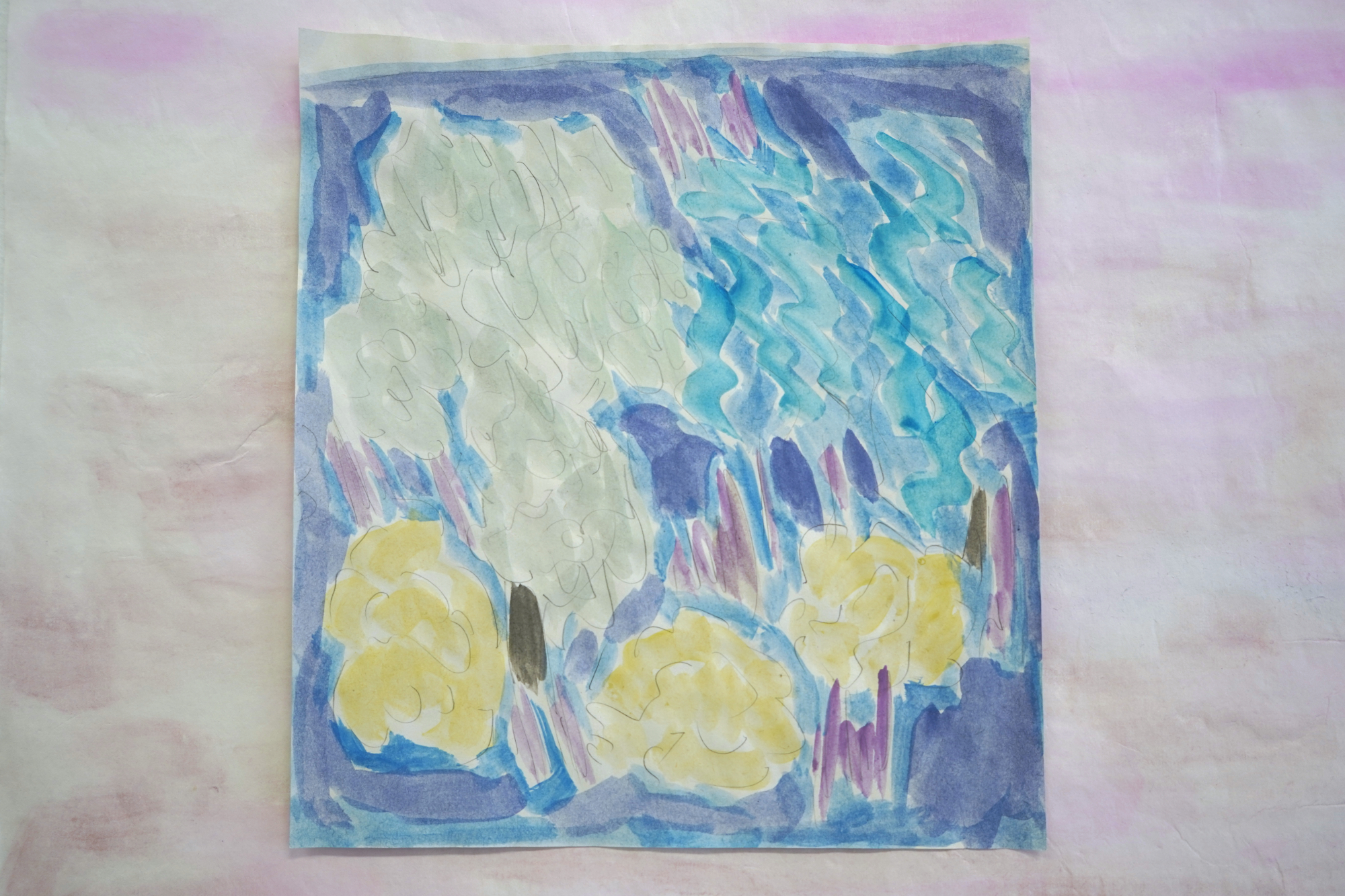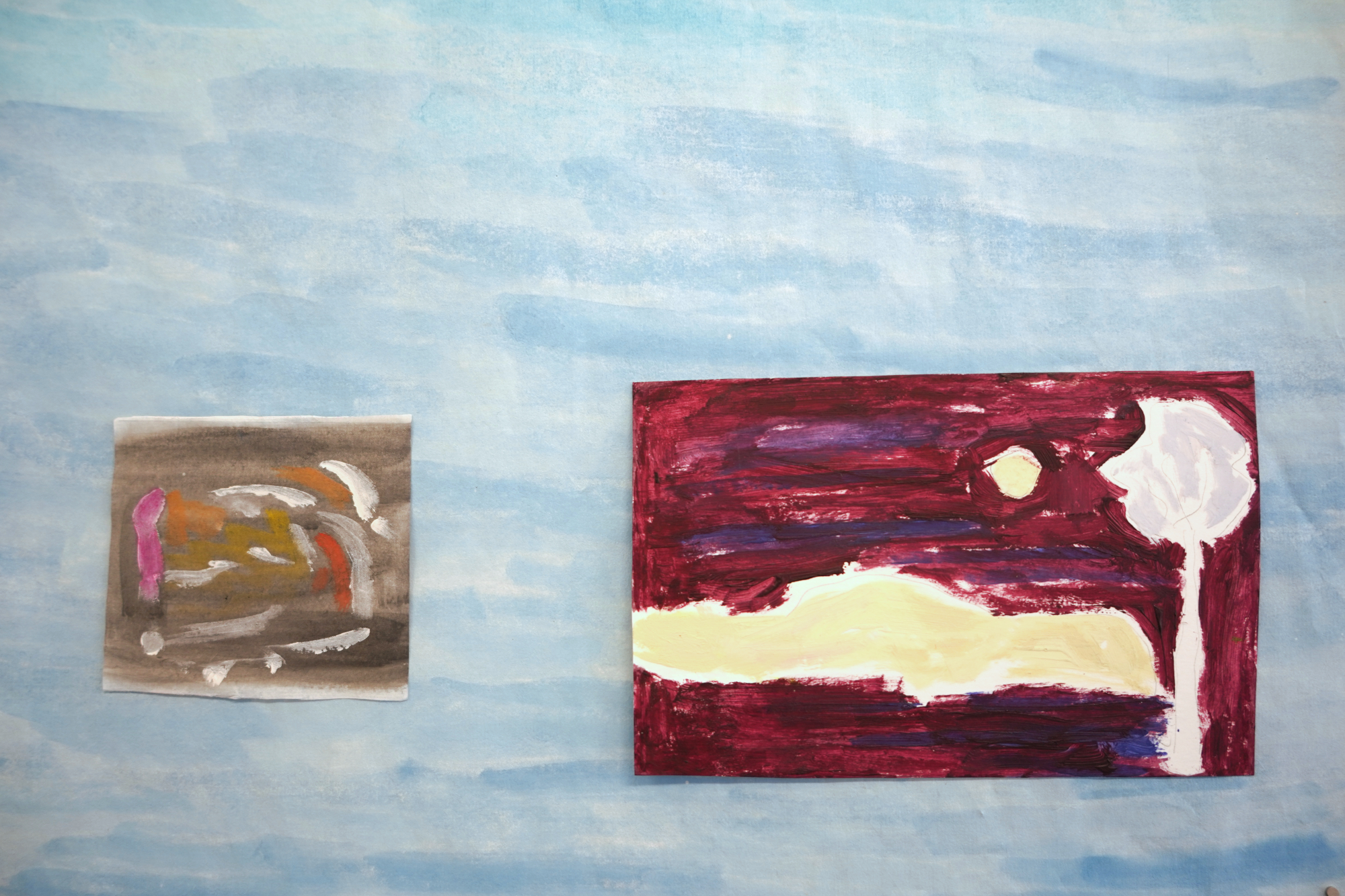 Comme beaucoup, les deux artistes ont engagé un mouvement de décentrement après la pandémie de Covid-19. Romain Bobichon est descendu dans le Tarn afin de vivre dans un bel endroit entouré d’ami.es. Amélie Charroin, s’est installée au sud-ouest de Lyon car elle voulait de l’espace pour créer et s’occuper de son enfant. Elle a délaissé les tables sur lesquelles elle travaillait dans des ateliers partagés pour peindre à la maison, directement sur le sol, avec ce qui était à sa portée : la vie, l’imaginaire, la routine domestique... Ses supports sont principalement faits de papiers recyclés. Elle utilise notamment des gouaches en pastille achetées au rayon scolaire des supermarchés, ce qui confère une qualité singulière à sa gamme colorée.