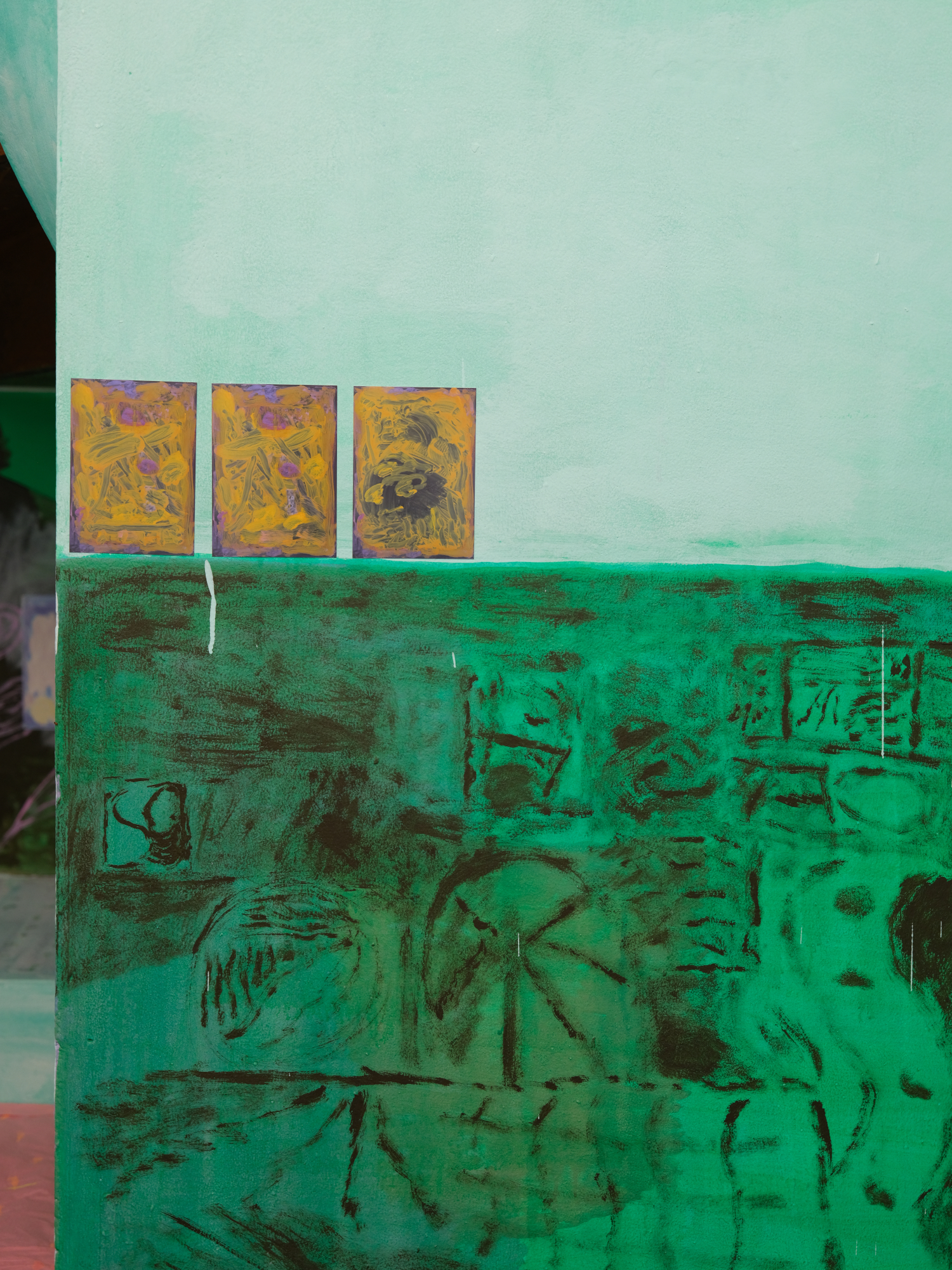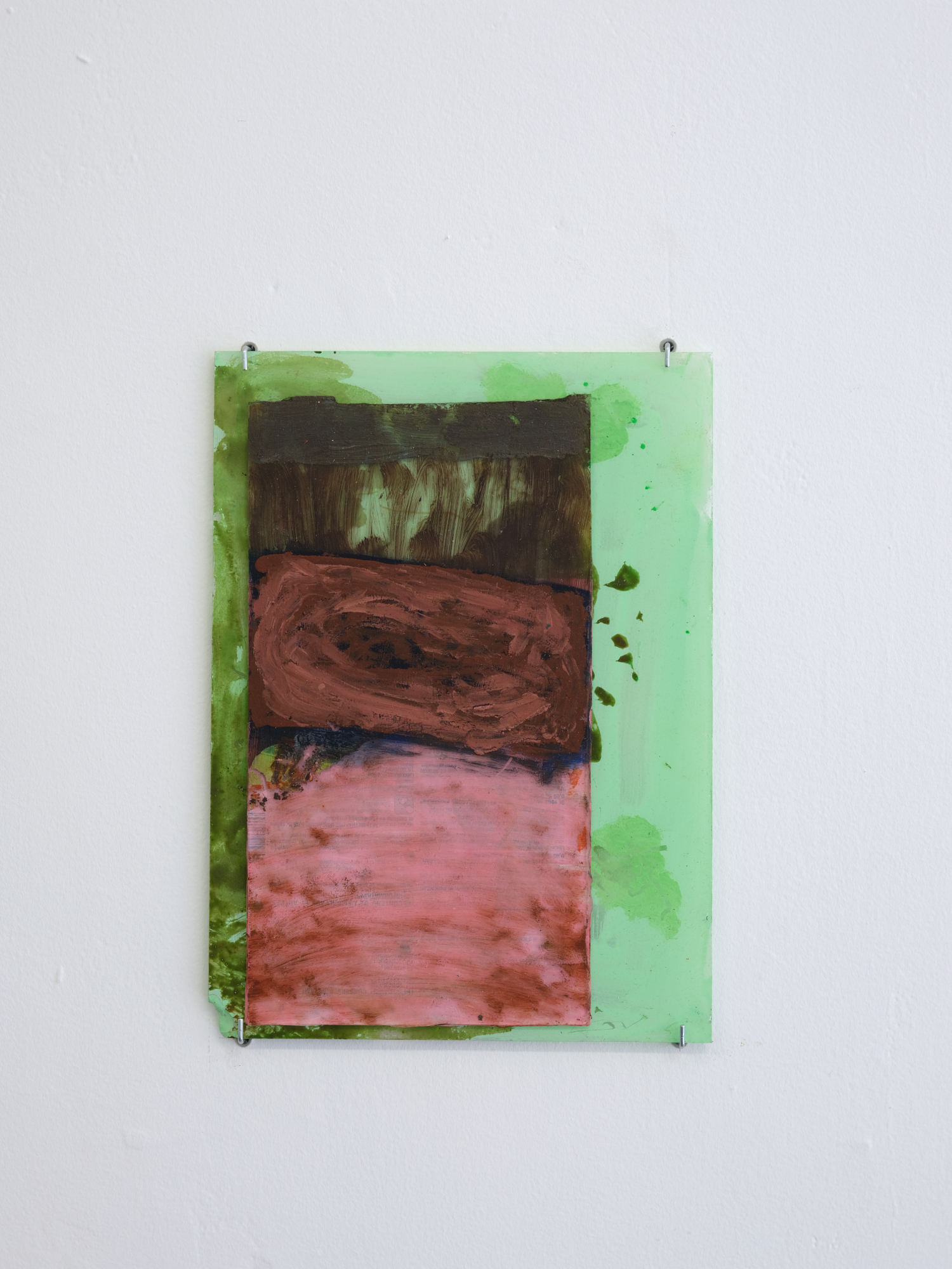 Romain Bobichon a d’ailleurs toujours aimé les kitchen table artists - celleux qui travaillent à la maison et font de leur espace domestique un atelier improvisé. Il peint sur des supports mobiles, explore la transparence, l’adaptabilité des teintes et leur réfraction dans les lieux où il se produit. Il s’intéresse aux pigments — qu’ils soient minéraux, animaux, végétaux ou synthétiques — à la richesse des couleurs et aux mouvements qu’elles génèrent : leur performativité activée grâce à la lumière, un élément essentiel dans l’apparition de la couleur et de ses reflets. Dans la série de gouaches réalisées sur la vitre de son scanner, il peint à l’œuf — un matériau très accessible qui lui permet de créer des textures veloutées. Il éprouve ainsi la mutabilité de la matière, l’effet de ses gestes et les enregistre grâce à l’appareil comme s’il s’agissait d’une partition musicale.