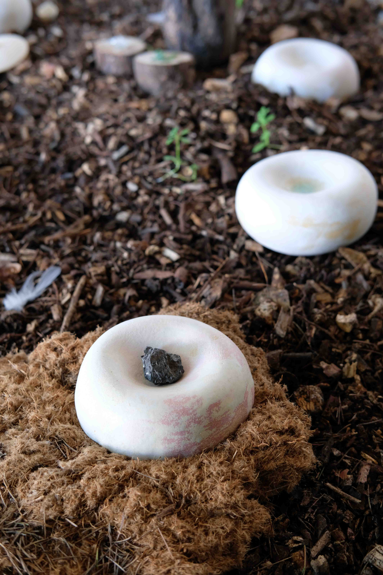 Lancer la terre, souffler la terre, gonfler la terre, écouter les oiseaux, faire une vidéo du vent dans les arbres et de la lumière qui danse sur le container des clés. Scruter le sol, se frotter les globes oculaires, se terrer entre les entrelacs des bouts de cerveaux, gonfler à bloc ses poumons, sa tête, son argile, sa récolte. Cette matière qui traverse mes narines pour venir être portée sur le dos de ces formes, rugueuses et pourtant si lisses.