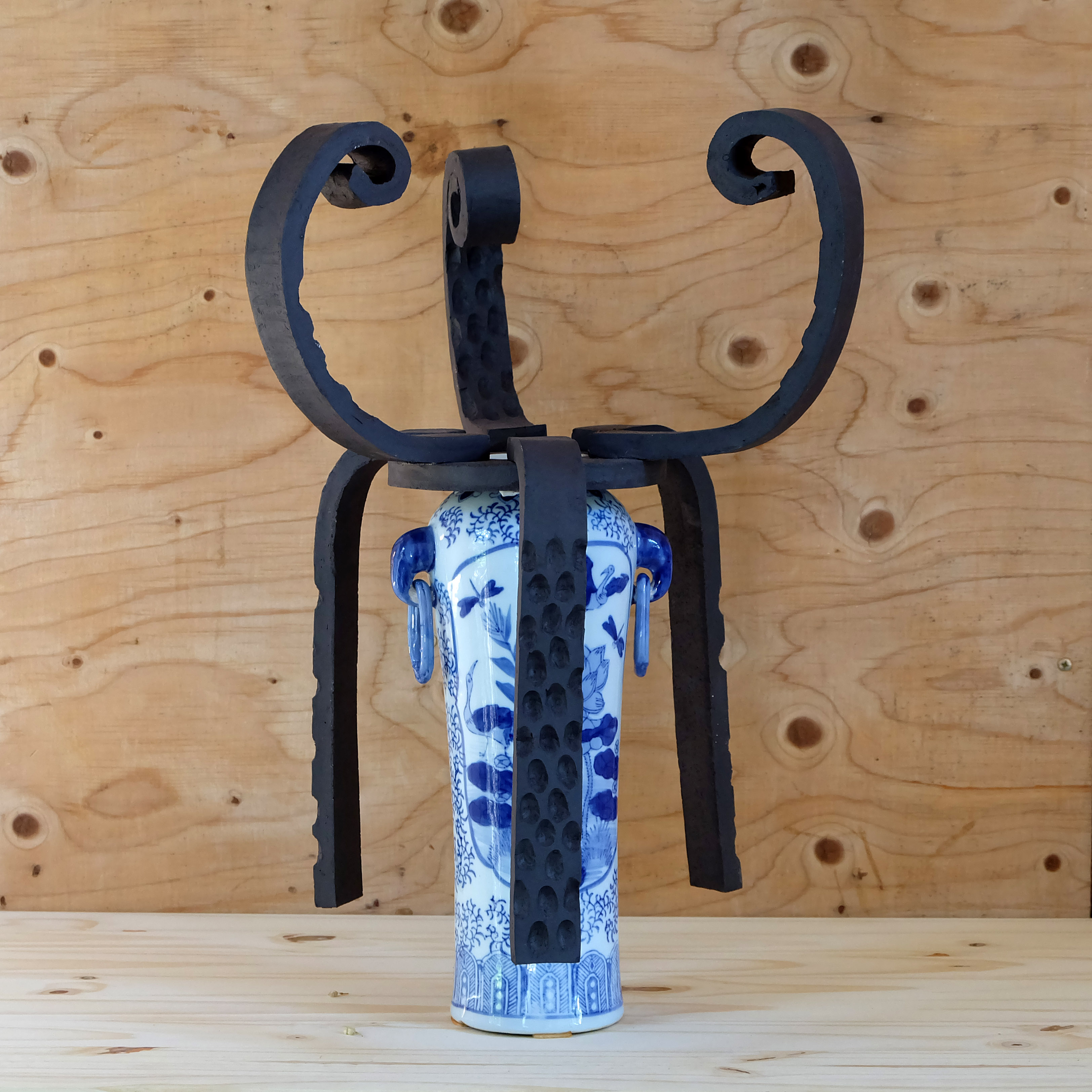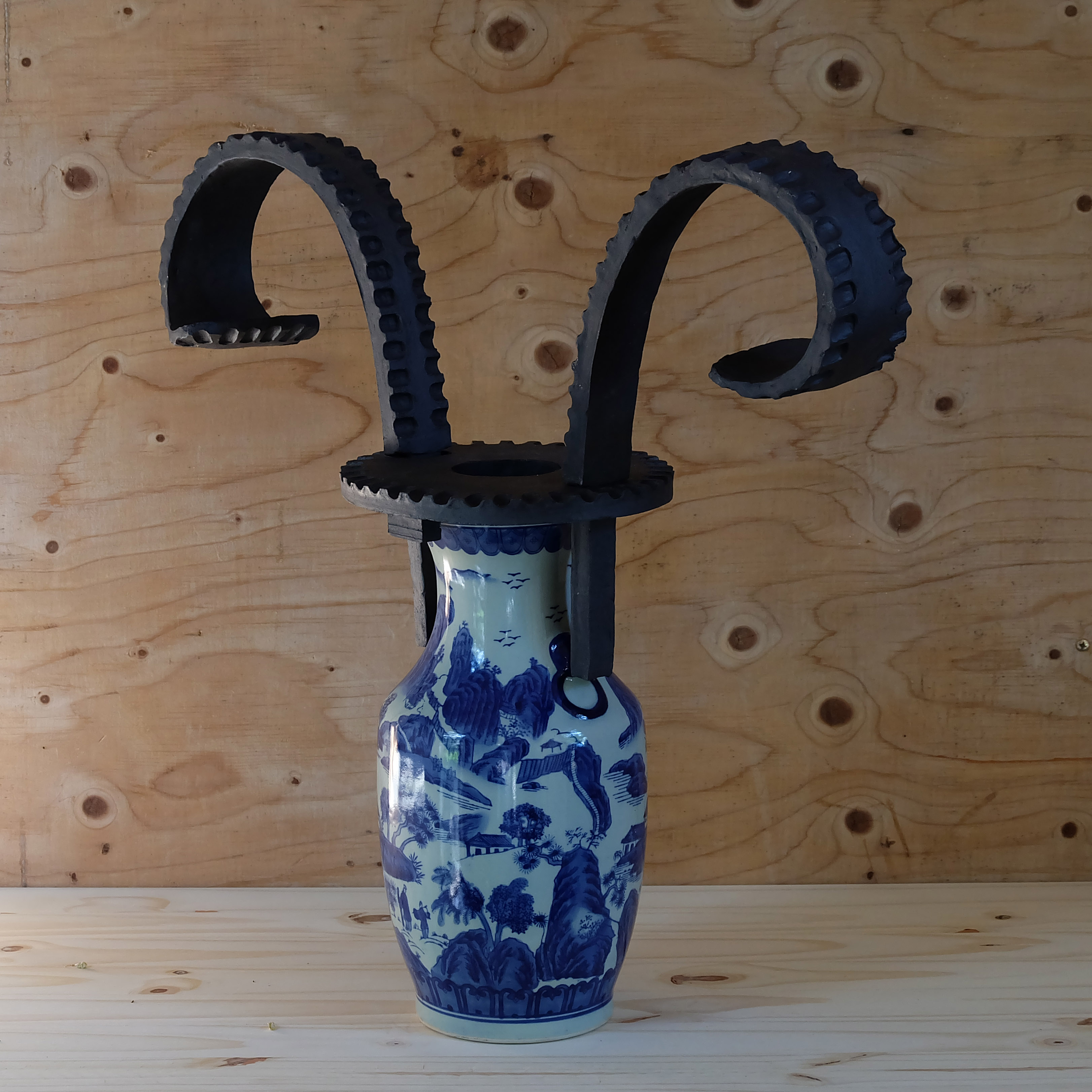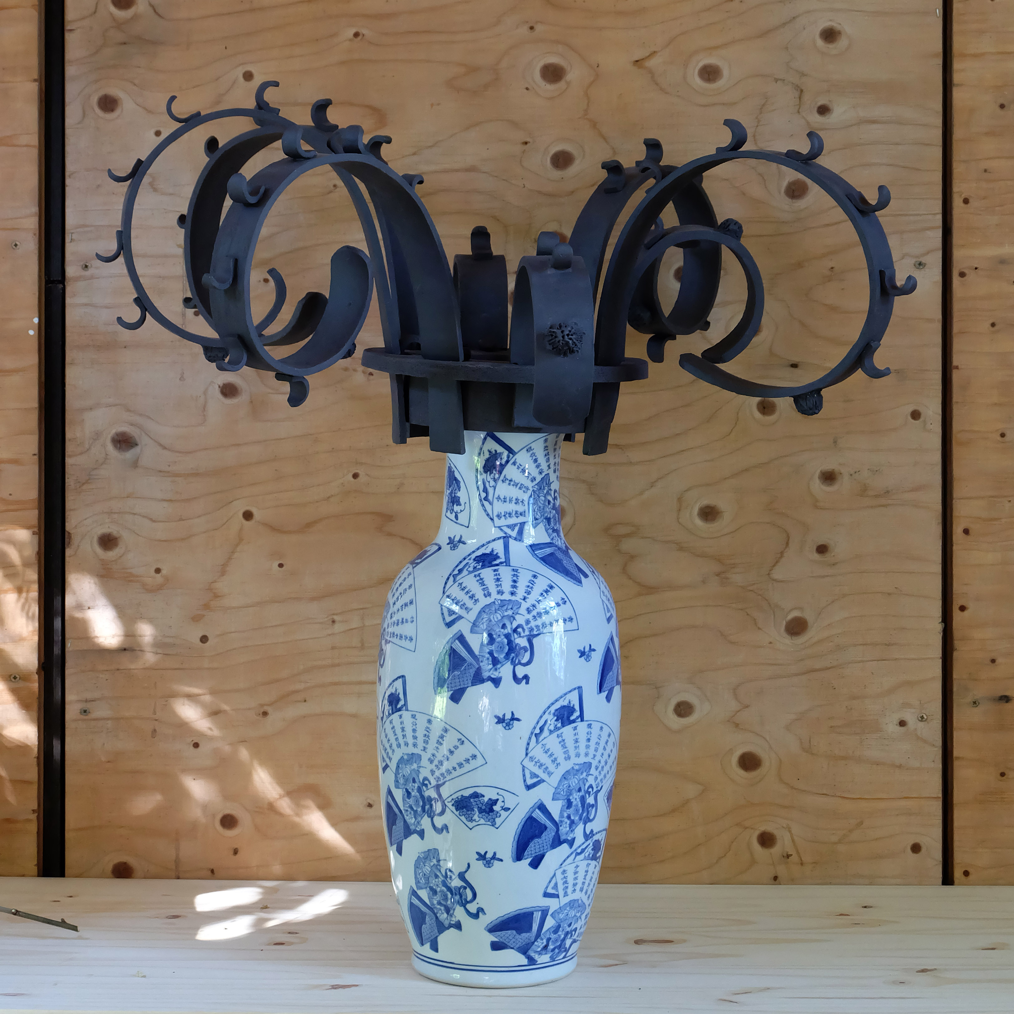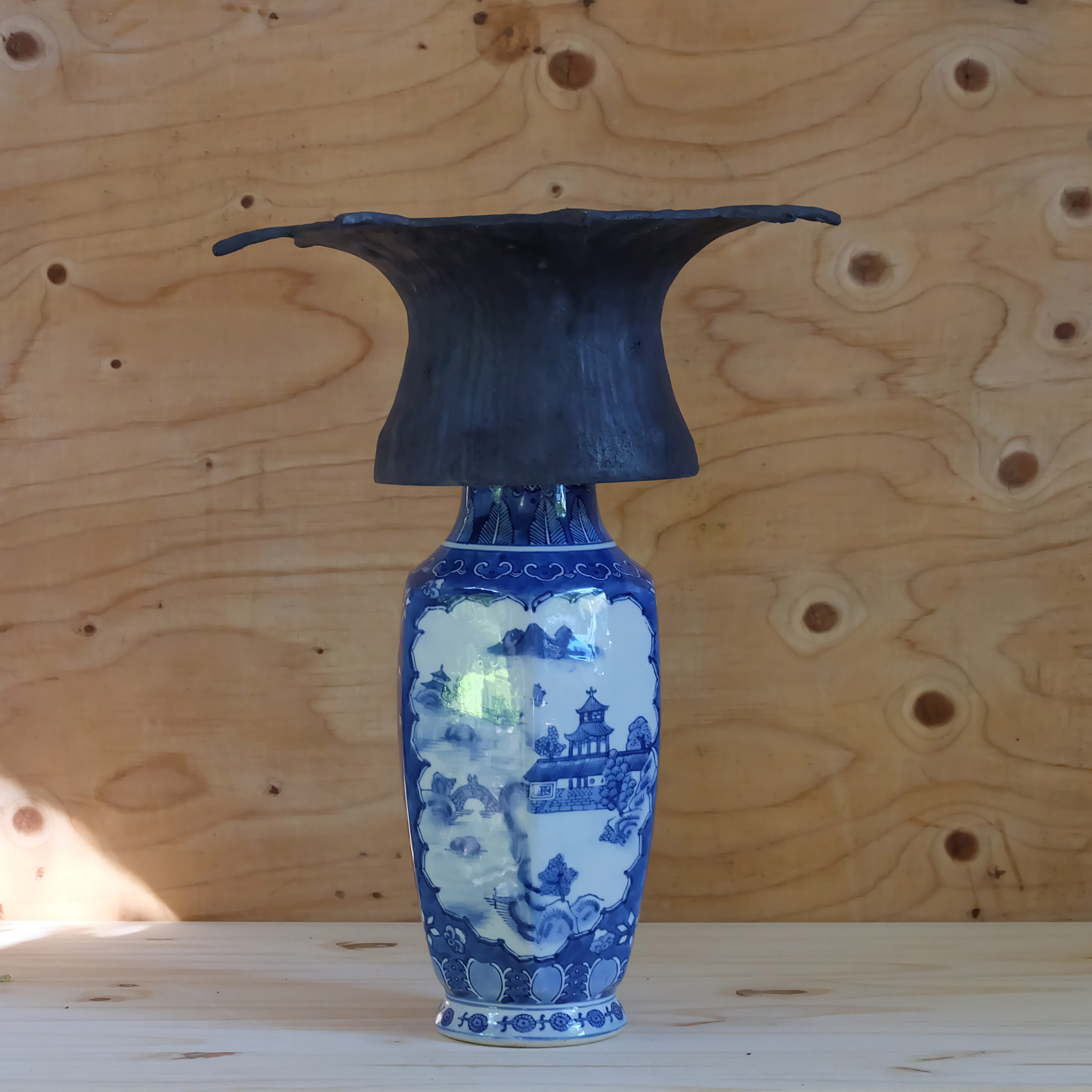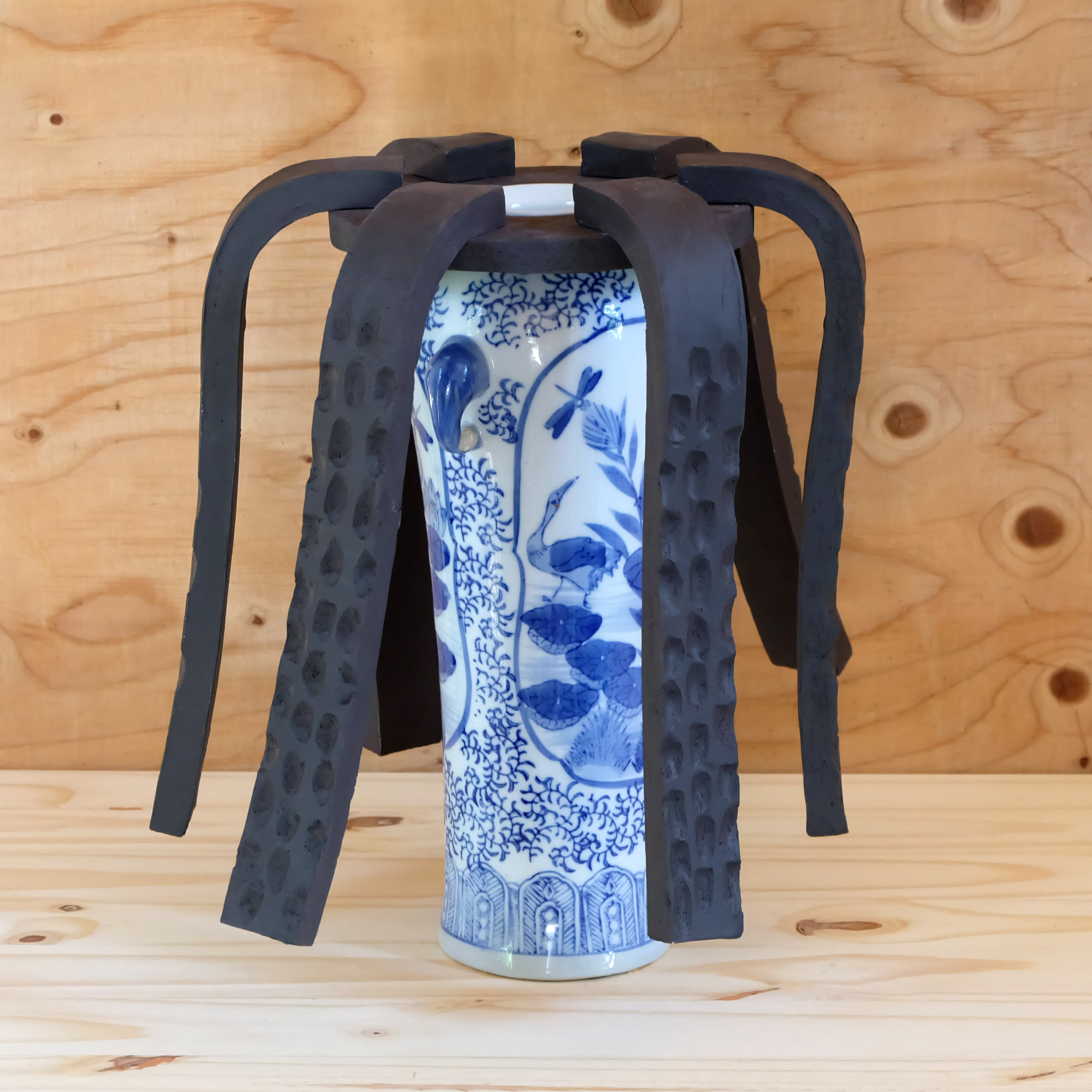 Je me suis souvenu des ces vases cultuels vus au Vietnam. À partir de ces objets traditionnels, souvent importés de Chine, j'ai décidé de faire un projet d'art décoratif, interrogeant l'idée de la colonisation. Depuis des siècles l'histoire du Vietnam se construit sur l'envahissement et la dépendance aux étrangers, qu'ils soient chinois ou occidentaux. Je voulais convoquer d'une façon poétique cette histoire de l'envahissement. J'allais produire des sur-vases brutalistes en grès noirs qui viendraient coloniser les fines porcelaines bleues et blanches. J'ai acheté des vases anciens et j'ai commencer à modeler des extensions venant se plugger sur les céramiques sans en abolir leur fonction, elles resteront des réceptacles à bouquets. J'ai ainsi réalisé durant ma résidence une dizaine d'objets hybrides, mêlant grès et porcelaine.