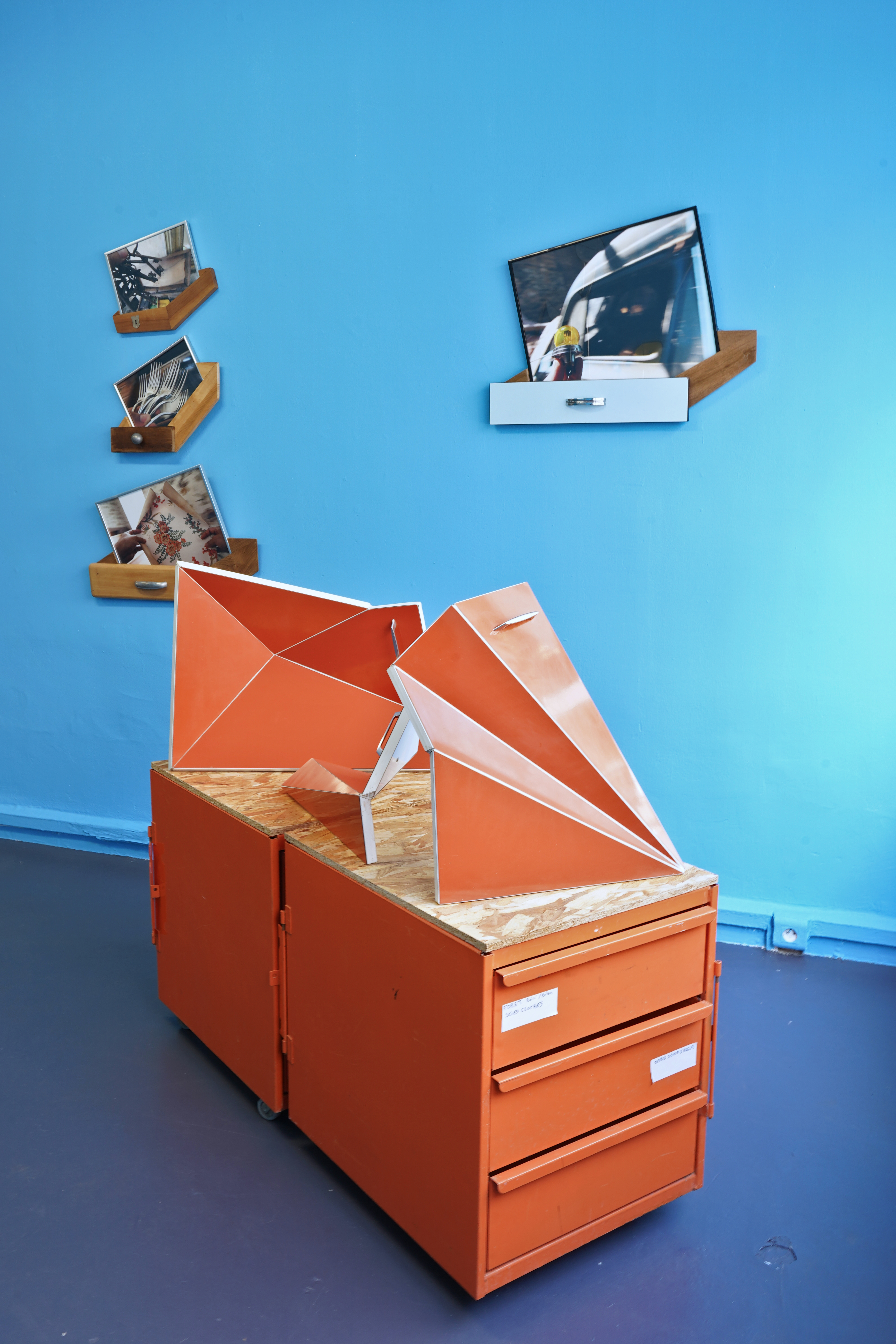 Les photos d’objets seront aussi intégrées à des sculptures, dans les « objets aplatis », adoptant un design paradoxal qui présente l’objet dans ses propres matériaux et en même temps le représente avec les codes de la perspective : c’est la série des tiroirs et boîtes accrochés au mur, contenant une photo d’objet encadrée. Les petites bennes d’acier montées sur des pieds de meubles, ses « déchètes sur pattes » contiennent aussi des images imprimées qui semblent jetées là - c’est justement l’utilité d’une benne. Installées dans la prairie devant sa maison, elles deviennent un troupeau comique qui prend la tangente.