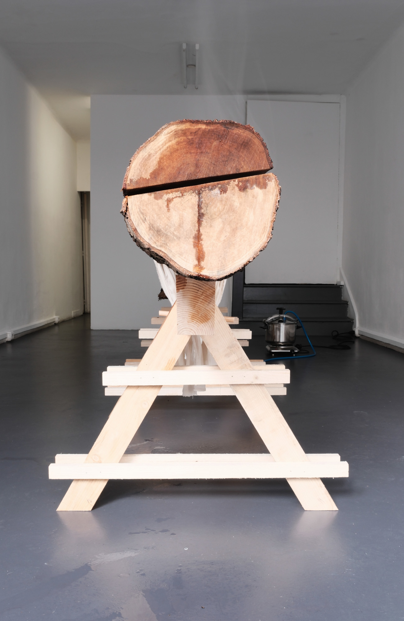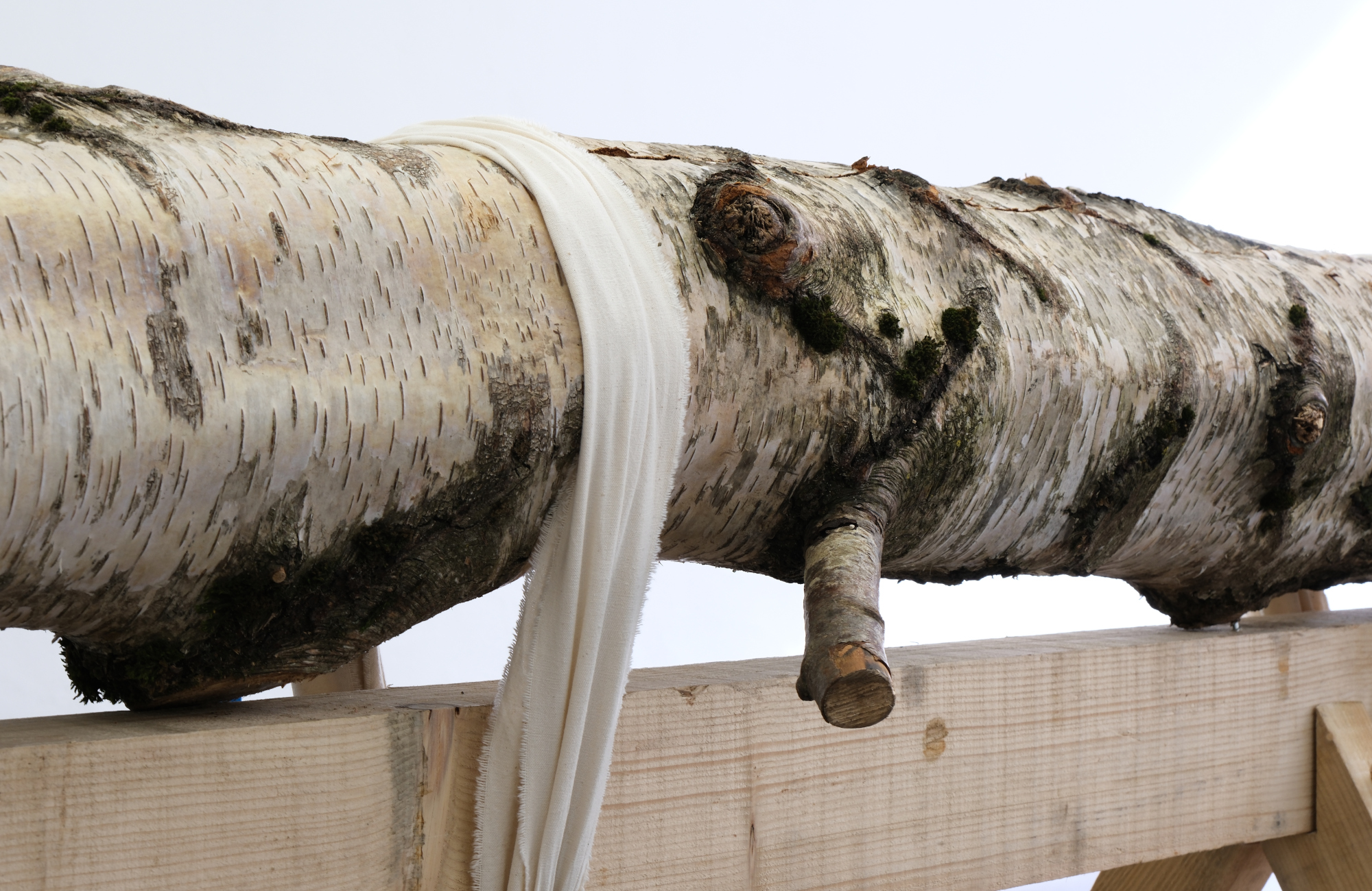 Le bouleau accepte les sols pauvres, humides, bouleversés ; ses racines traçantes lui permettent de coloniser rapidement un nouvel espace. Comme toutes les espèces dites « pionnières », celles qui expriment plus que d’autres le mouvement spontané de toute parcelle vers la forêt (sous nos latitudes en tout cas), il est de fait souvent traité comme une mauvaise herbe. Dans le parc naturel du Pilat, il prospère dans les interstices entre les forêts les plus matures remarquables pour leur biodiversité, et les zones exploitées. C’est là que Boris Raux est venu prélever l’un d’entre eux, un vénérable bouleau qui déjà entamait son déclin vers la mort. Exposé sur une structure en pin à la manière d’un gisant, cet être végétal se voit offrir ici un dernier hommage : la force encore vive de son corps débité à la scie (transport en Traffic oblige) peut s’exprimer pour une saison encore, sous la forme de son odeur. Dans un élan de réciprocité, le bouleau ainsi honoré, grâce à la vapeur d’eau qui, en le traversant, se charge de ses huiles essentielles, prend soin de nos sinus.